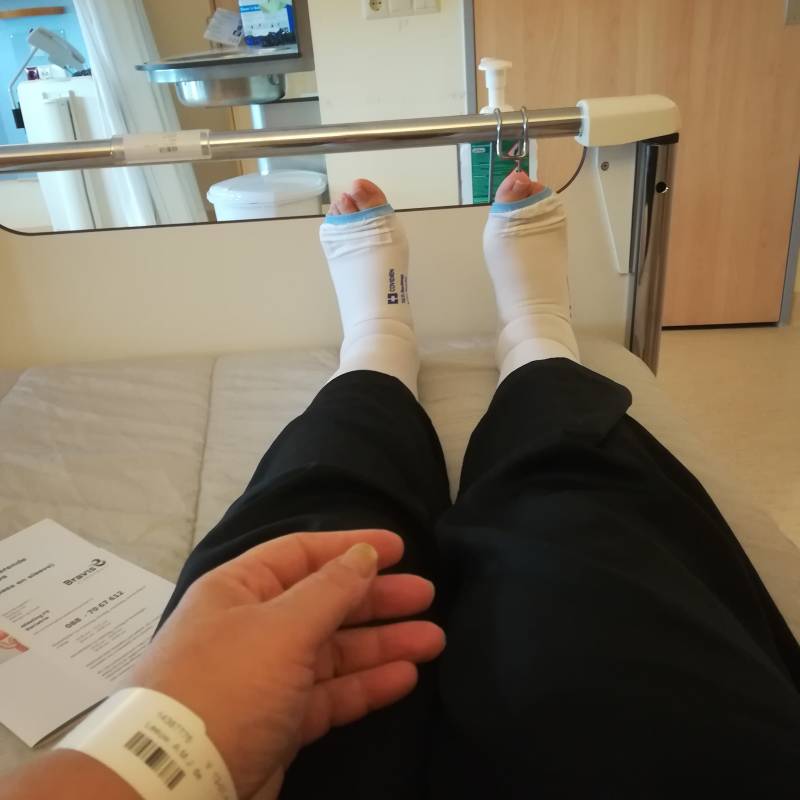 Daar lig ik dan. Heb een beetje honger hihi iets dat ik straks niet meer zal hebben. De witte dingen om mijn voeten zijn steunkousen deze moet je 1 mnd lang dragen tegen een trombose been. Vanmiddag om 2 uur ga ik naar de ok tegen 5 uur half 6 ben ik jopehope weer terug op de afdeling. Voor nu nog even wachten.