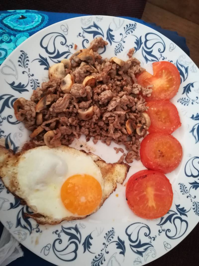Ik wilde eigenlijk twee dingen eten maar ik laat de soep staan tot vanmiddag of vanavond ik kijk wel. Vandaag had ik wat gehakt met champignons 1 gebakken ei en tomaat gegeten. Het was weer lekker.